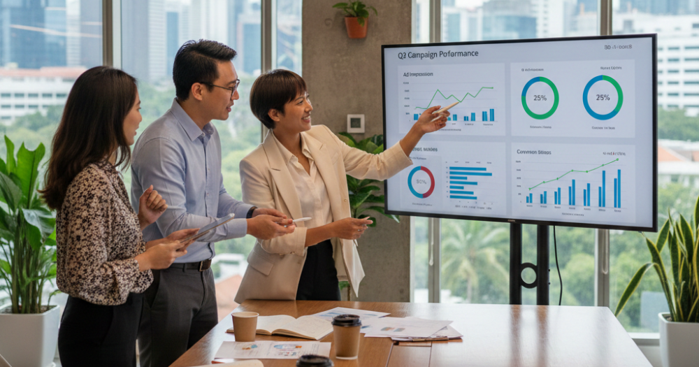 A Singapore-based creative pod team from Thrivemediasg reviewing data in a high-velocity testing environment for Creative-Led Growth.